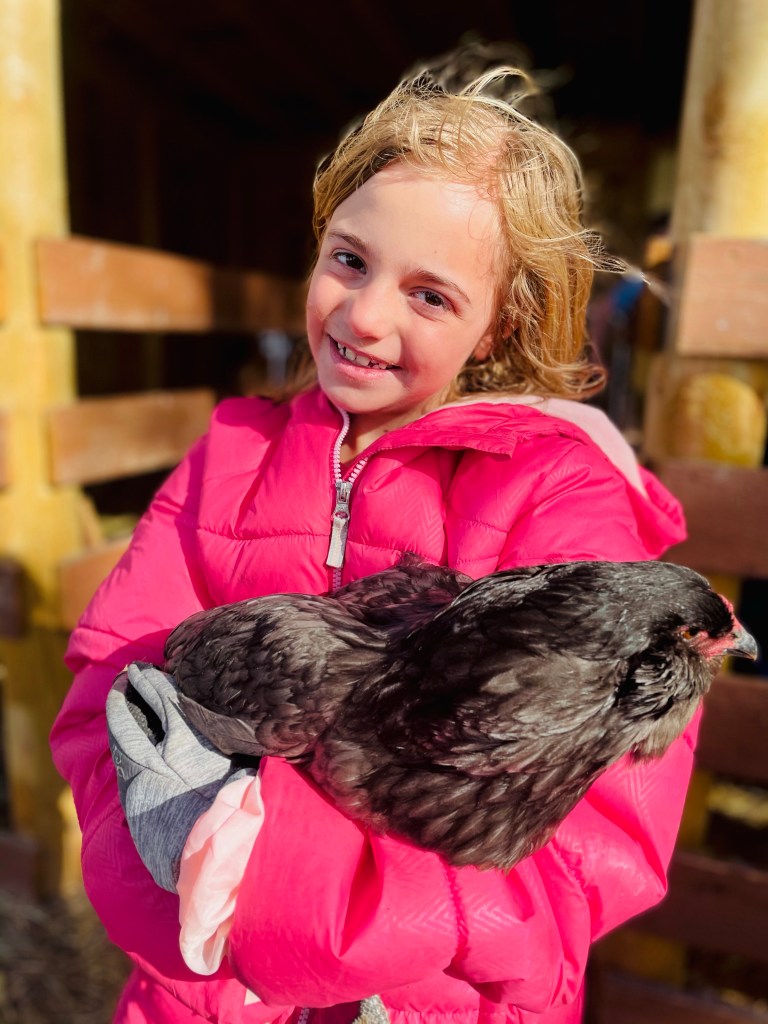 This girl loves her chickens. She carries them around like dolls and they let her!